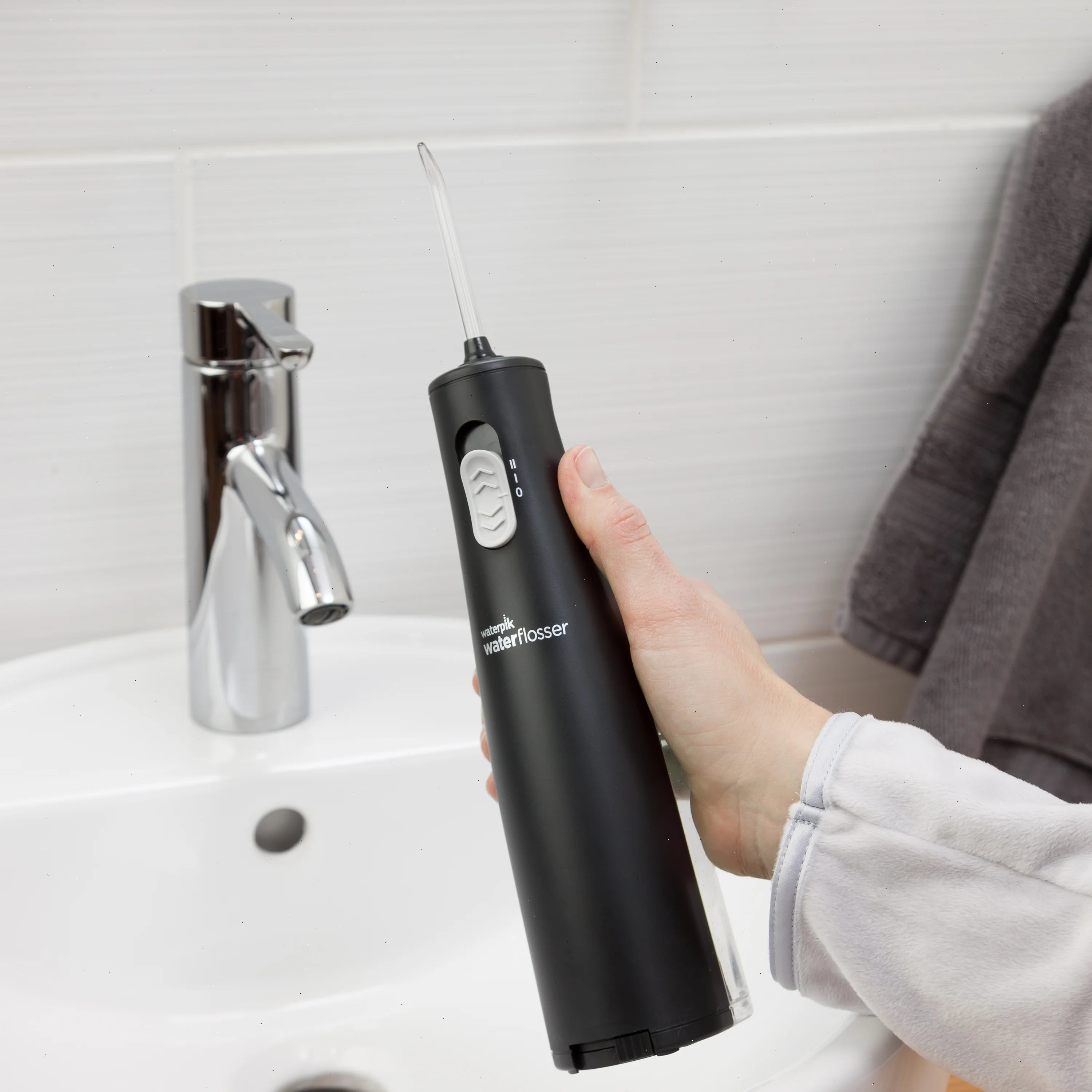 Battery operated and portable, the Cordless Express water flosser is perfect for smaller bathrooms and travel. This handheld water flosser features a lightweight, waterproof design and may be used in the shower.