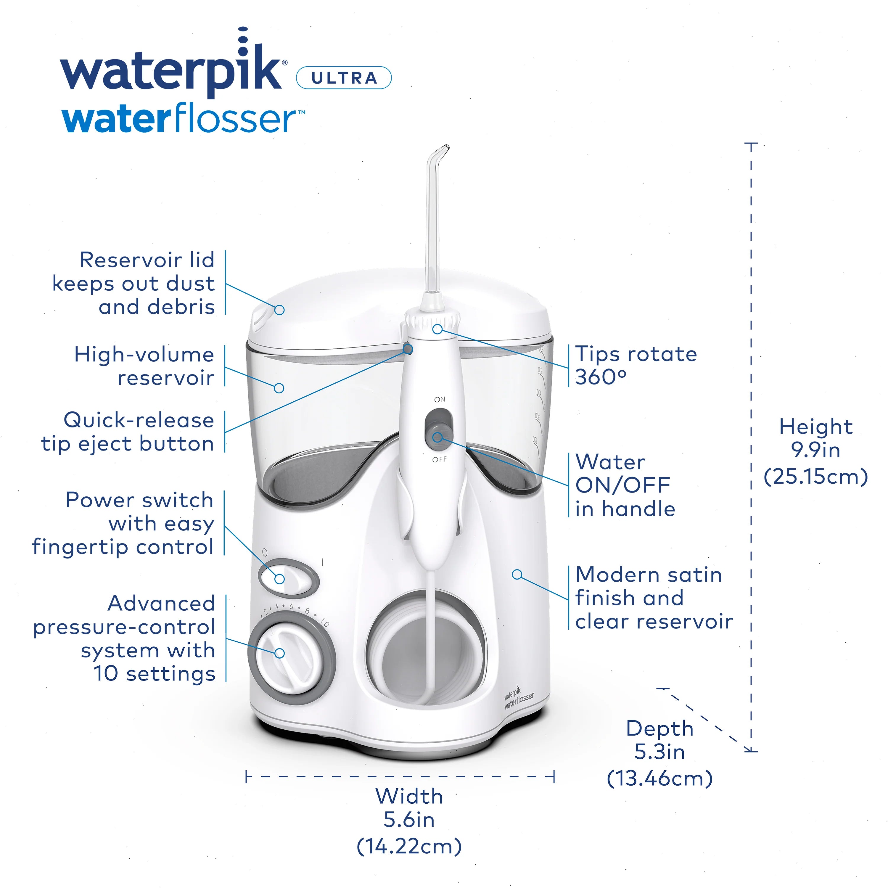 The Ultra water flosser delivers maximum performance and convenience with 10 settings, an on/off water switch the handle, storage for extra tips built into lid and global voltage compatibility.